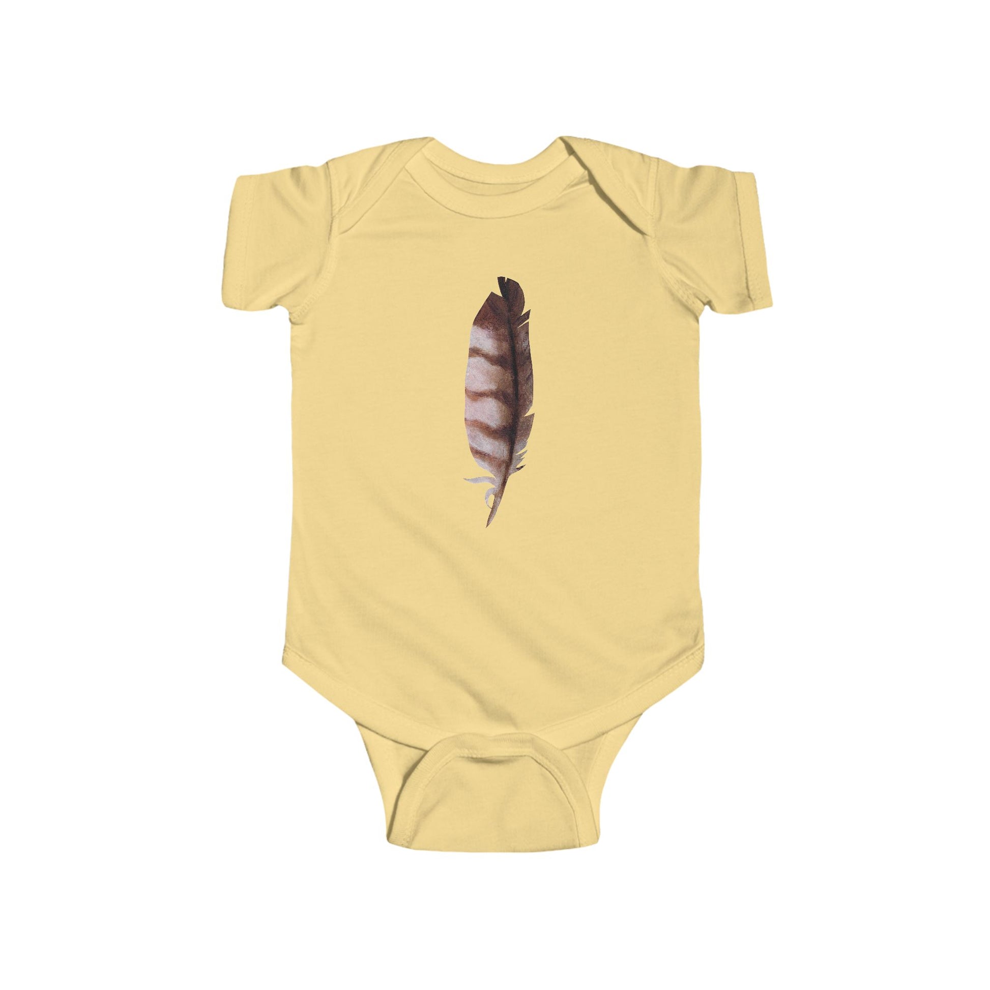 Soft, cheerful, and built for tiny adventures — this infant bodysuit carries a hand painted owl feather design by artist and author Cee. The fabric lays gentle against baby skin while the ribbed neck and side seams keep the shape through crawls and cuddles. Snaps at the crotch make diaper changes quick and low-fuss, and the tear-away label prevents irritation. Lightweight and breathable, it’s made to move with little bodies and to withstand many washes without damage.